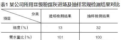優(yōu)質(zhì)的粉煤灰摻入混凝土可明顯地改善混凝土的和易性,當(dāng)粉煤灰摻量大于膠材總量的5%~10%時(shí),效果極為明顯?,F(xiàn)今在混凝土實(shí)際生產(chǎn)中,粉煤灰摻量往往達(dá)到20%,有的甚至高達(dá)30%,但混凝土的和易性卻不盡人意。抽取原材料進(jìn)行檢測時(shí),發(fā)現(xiàn)粉煤灰的檢測結(jié)果經(jīng)常不滿足標(biāo)準(zhǔn)要求或者與驗(yàn)收時(shí)的結(jié)果相差甚遠(yuǎn)?,F(xiàn)以某公司所用Ⅱ級粉煤灰進(jìn)場及抽樣常規(guī)檢測結(jié)果進(jìn)行對比,見表1。