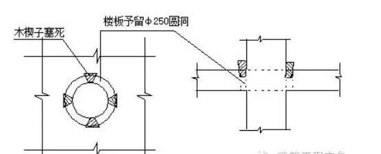 ③.樓板處留洞固定泵管如下圖。在首層及其它樓層頂板予留直徑250mm的圓洞便于穿管。管周圍用木楔楔緊,不少于四個(gè)。