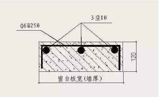 對(duì)于砌體墻,外窗洞下口必須澆筑寬與墻厚相同、高度不小于120mm、長(zhǎng)度每邊伸入墻內(nèi)不少于400mm(不足400mm時(shí)通長(zhǎng)設(shè)置)的混凝土窗臺(tái)板(針對(duì)窗臺(tái)下砌體八字縫措施),已設(shè)鋼筋混凝土凸窗套或窗臺(tái)板者除外。窗臺(tái)板為C20混凝土,內(nèi)配3Φ10主筋和φ6@250U型分布筋。