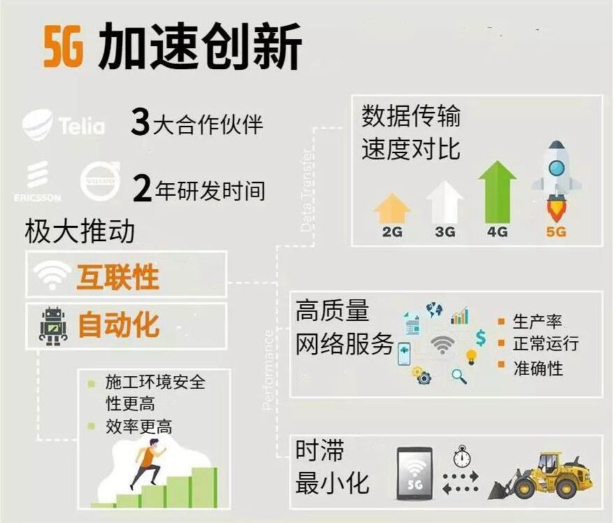 2019年3月,沃爾沃建筑設(shè)備攜手瑞典電信運(yùn)營(yíng)商特利亞(Telia)和愛(ài)立信啟動(dòng)了瑞典首個(gè)工業(yè)5G網(wǎng)絡(luò),將用于遠(yuǎn)程控制輪式裝載機(jī)測(cè)試。憑借極短的響應(yīng)時(shí)間、大容量、高度的移動(dòng)網(wǎng)絡(luò)可接入性,5G技術(shù)能為提高效率、降低成本和降低環(huán)境風(fēng)險(xiǎn)。
