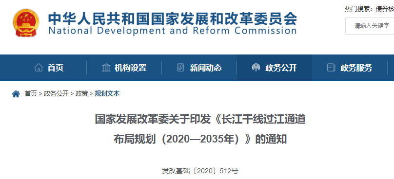 ??《長江干線過江通道布局規(guī)劃(2020—2035年)》(以下簡稱《規(guī)劃》)業(yè)經(jīng)國務院批準,現(xiàn)印發(fā)給你們,請按照執(zhí)行,并就有關(guān)事項通知如下:
