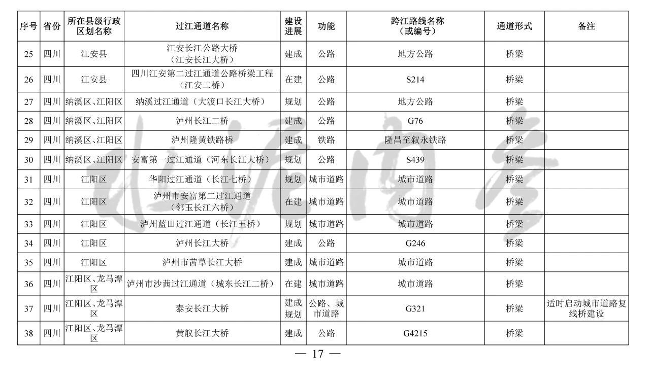 四川?。?0座):雞翅膀大橋、臨港掛弓山長江大橋、羅龍過江通道、納溪過江通道(大渡口長江大橋)、安富第一過江通道(河東長江大橋)、瀘州藍田過江通道(長江五橋)、瀘遵過江通道、新路口過江通道、合江新城過江通道(白沙長江大橋)、榕山過江通道(榕山長江大橋)