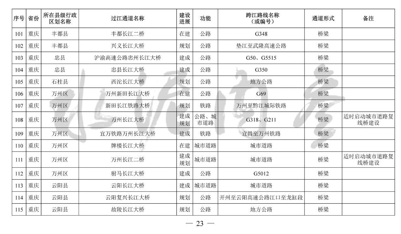 重慶市(17座):市域(郊)鐵路跳蹬至江津線長江大橋、西彭長江大橋(支坪長江大橋)、小南海長江大橋、中壩過江通道、黃桷坪長江大橋、軌道27號線過江通道、重慶至黔江鐵路過江通道、黃桷沱大橋、長壽長江三橋、涪陵石沱長江大橋、涪陵龍頭港長江大橋、涪陵江北長江大橋、興義長江大橋、西沱長江大橋、云陽復興長江大橋、奉節(jié)二橋、巫山長江二橋