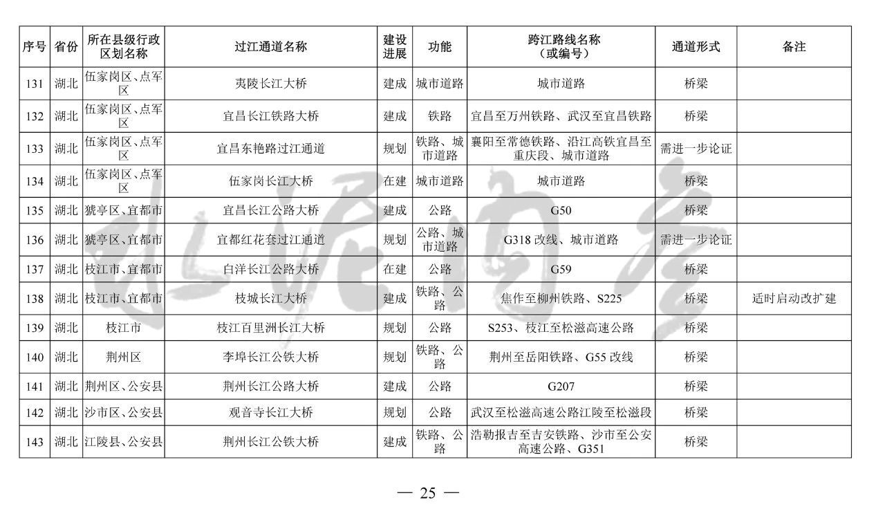 湖北?。?4座):巴東長江公路二橋、興山至長陽高速公路過江通道、宜昌東艷路過江通道、宜都紅花套過江通道、枝江百里洲長江大橋、李埠長江公鐵大橋、觀音寺長江大橋、武漢都市區(qū)環(huán)線漢南過江通道、軍山長江二橋、武漢軌道17號線過江通道(青菱過江通道)、武漢白沙洲過江通道、武漢軌道12號線白沙洲過江通道、武漢軌道11號線三期漢陽段過江通道、武漢軌道13號線過江通道(小東門過江通道)、二七路過江通道、武漢軌道10號線二七過江通道、武漢軌道12號線丹水池過江通道、堤角過江通道、武漢軌道20號線過江通道、武漢軌道25號線過江通道(長江新城過江通道)、武漢軌道新港線陽邏過江通道、光谷過江通道、新港高速雙柳長江大橋、鄂黃第二過江通道鄂湘界(1座):監(jiān)利至華容公鐵兩用大橋