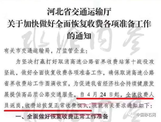 據中國砂石協(xié)會和中國砂石網了解,日前,河北省交通運輸廳發(fā)布《關于加快做好全面恢復收費各項準備工作的通知》稱為堅決打贏打好取消高速公路省界收費站第十戰(zhàn)役攻堅戰(zhàn),做好全面恢復收費各項準備工作,確保取消高速公路省界收費站工作圓滿收官,為促進全省經濟社會持續(xù)健康發(fā)展提供高品質公路交通服務,自4月24日起,全體收費人員返崗,收費站恢復正常收費模式。