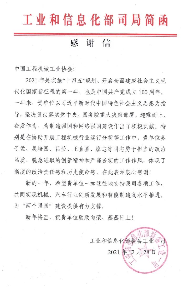 近日,工業(yè)和信息化部裝備工業(yè)一司致函中國工程機械工業(yè)協(xié)會,對協(xié)會一年來,堅持以習近平新時代中國特色社會主義思想為指導,堅決貫徹落實黨中央、國務院重大決策部署,迎難而上,奮發(fā)作為,在制造強國和網絡強國建設工作,特別是積極配合協(xié)助開展工程機械行業(yè)運行分析等工作表示感謝!
