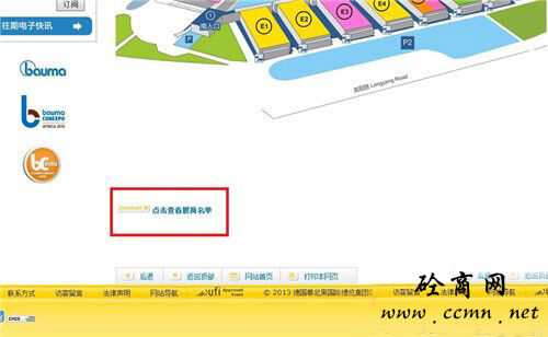 1.電腦用戶可以直接在bauma China 2014的官方網(wǎng)站上查看(按步驟點擊紅色方框部分即可)