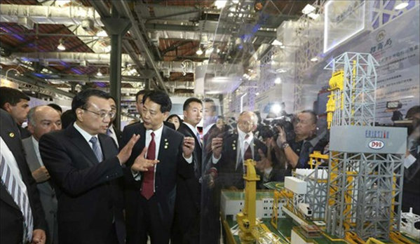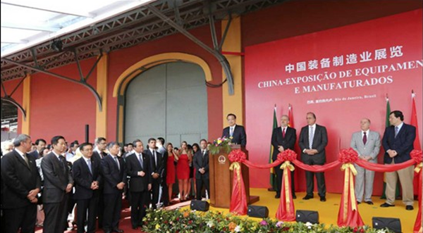 當?shù)貢r間20日,李克強在里約熱內盧州州長佩藏和巴西外長維埃拉的陪同下來到里約民港碼頭,參觀正在這里舉辦的中國裝備制造業(yè)展覽,并為展覽開幕剪彩。展覽包括鐵路及軌道交通、電力、通信、金融等10個板塊,代表國內裝備制造業(yè)最高水平的30家中國企業(yè)參展。