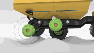 Centaur鉸接式卡車具備強大的裝載能力,其載重能力或?qū)⒊^40噸,巨大的輪胎和堅固的底盤支撐起了這只龐然大物。Centaur鉸卡采用了非常獨特的懸掛設(shè)計,6個輪胎分別獨立地與主軸連接,連接處可以自由轉(zhuǎn)動,這使得Centaur在坎坷不平的路面上如履平地。