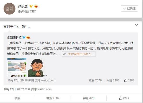 “扶老人險”一上線立即引起了網(wǎng)友們的熱議,就連羅永浩老師也在微博上公開力挺,而據(jù)支付寶方面的統(tǒng)計,該險種開售3天便有2.6萬人投保,可見其關(guān)注度。