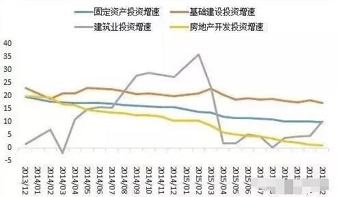 2015年,全國固定資產(chǎn)投資(不含農(nóng)戶)551590億元,比上年名義增長10%(扣除價格因素,實際增長12%),增速比1-11月份回落0.2個百分點。從環(huán)比速度看,12月份固定資產(chǎn)投資(不含農(nóng)戶)增長0.68%。建筑業(yè)固定資產(chǎn)投資總額4895億元,同比增長10.2%,增速較1-11月提高了5.4個百分點。今年以來,制造業(yè)投資大勢已去,房地產(chǎn)投資降至歷史低點且尚未見底。由于基建投資具有逆周期特性且保持快速增長,穩(wěn)增長寄希望于基建投資托底。發(fā)改委更是密集批復基建項目助力穩(wěn)增長?;A設施投資(不含電力)101271億元,比上年增長17.2%,增速比1-11月份回落1個百分點。其中,水利管理業(yè)投資增長21%,增速回落2.3個百分點;公共設施管理業(yè)投資增長20.2%,增速回落0.3個百分點;道路運輸業(yè)投資增長16.7%,增速回落0.8個百分點;鐵路運輸業(yè)投資增長0.6%,增速回落0.2個百分點。