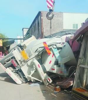 一輛江淮標(biāo)志的白色攪拌車在吊車的牽引下斜靠在墻上。據(jù)目擊者介紹,事發(fā)下午1時(shí)左右,當(dāng)時(shí)攪拌車正在倒車,突然車右后輪下方的路面塌陷,攪拌車失去平衡,向右方翻倒,有兩名路過(guò)此地的行人躲閃不及,被壓在了車身下。