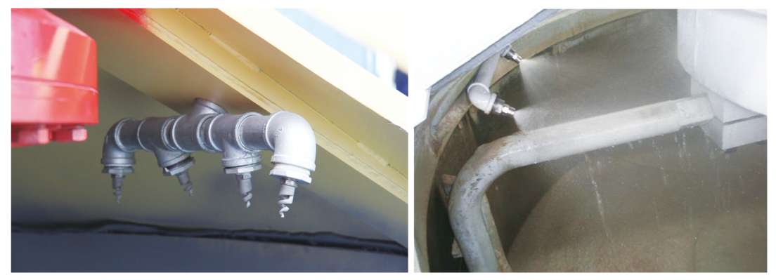 水路采用上置式結(jié)構(gòu)(專利產(chǎn)品),解決管路中殘余外加劑和水的現(xiàn)象,避免可客戶換配方時造成損失。噴頭采用螺旋形實心圓錐形噴嘴,具有細(xì)密均勻的霧化效果,覆蓋面積大,使物料攪拌均勻。