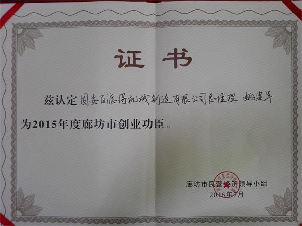 近日,固安百濾得機(jī)械制造有限公司總經(jīng)理姚建軍榮獲廊坊市創(chuàng)業(yè)功臣獎(jiǎng),獎(jiǎng)金十萬(wàn)元整,也正是如此,更加說明市場(chǎng)對(duì)百濾得的認(rèn)可,百濾得對(duì)市場(chǎng)的優(yōu)質(zhì)服務(wù)。