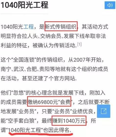 “1040陽(yáng)光工程”為新型傳銷組織,新型傳銷特點(diǎn)如下: