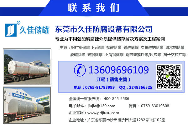 久佳防腐是一家專業(yè)生產(chǎn)100立方硝酸儲罐  久塑牌不銹鋼儲罐供應(yīng)  危廢 化成箔不銹鋼儲罐設(shè)備的知名品牌。久佳防腐旗下的儲罐設(shè)備適用于危廢處理、環(huán)保、化工、水處理、電子、電廠、能源等行業(yè)中酸堿鹽腐蝕介質(zhì)的儲存及中和反應(yīng),華南區(qū)大型鋼襯塑、PE、不銹鋼、碳鋼儲罐生產(chǎn)廠家。更多聚羧酸儲罐等介質(zhì)儲存容器資訊,請關(guān)注久佳防腐儲罐專注【酸堿鹽腐蝕性介質(zhì)】防腐容器設(shè)計方案。久佳防腐安全儲存25年載,精工產(chǎn)品、卓越品質(zhì)、服務(wù)完善、值得信賴!