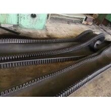大傾角擋邊輸送帶的基帶是由上覆蓋膠、下覆蓋膠、帶芯和橫向剛性層四部分組成。上覆蓋膠厚度一般為3-6mm;下覆蓋膠厚度一般為1.5-4.5mm,帶芯材料承受拉力,其材料可以是棉帆布(CC)、尼龍帆布(NN)、聚酯帆布(EP)或鋼繩芯(ST)。為了增加基帶的橫行剛性,在芯體上下添加特殊加強(qiáng)層,稱(chēng)橫向剛性層?;鶐У膶挾纫?guī)格,與普通膠帶相同,符合GB7984-2001的標(biāo)準(zhǔn)規(guī)定。