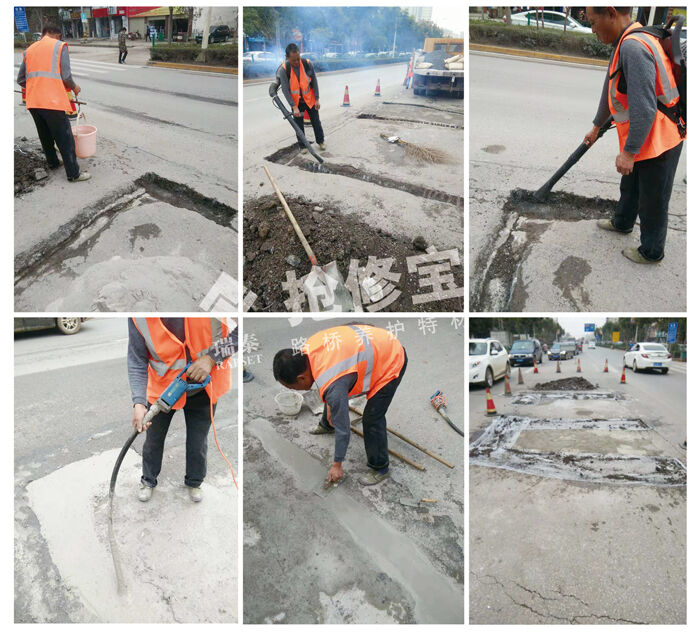 以使用搶修寶水泥路面修補料RT-2為例來說明。使用搶修寶水泥混凝土路面修補料修補病害非常簡單,首先在修補前,一定要對水泥混凝土路面坑槽進行清理,然后再用高壓水槍沖刷干凈,沖刷后用風槍將明水吹干,保持濕潤狀態(tài);隨后根據坑槽的深淺,按施工比例充分攪拌修補料,攪拌后攤鋪于坑槽部位收光養(yǎng)護即可。搶修寶水泥路面修補料的粘結力表現、抗壓耐磨表現、無收縮無老化表現均良好,修補后材料不易脫落不易老化,使用壽命長,可以一次性修復水泥混凝土路面坑槽病害,恢復路面美觀及功能。