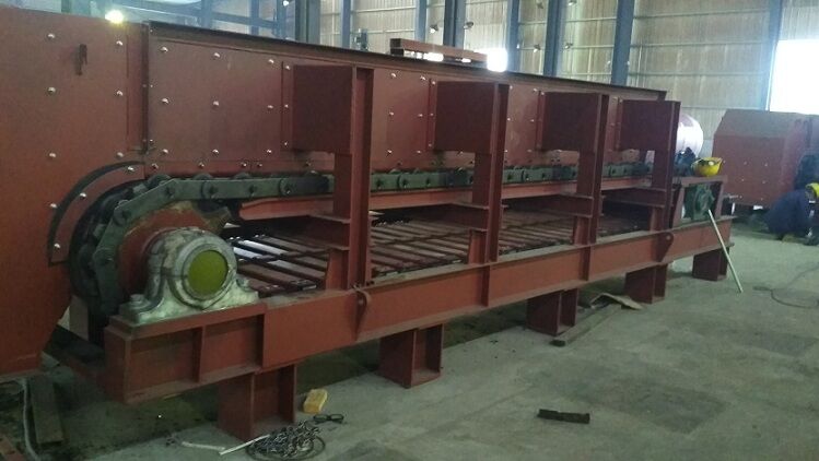 我公司研制的新型板式喂料機,結(jié)合皮帶輸送機和板式喂料機的優(yōu)點,能輸送含水率高的粘性物料,獨特的新型刮料裝置,能把粘在高強皮帶上的料自動清理下來,清理下來的物料掉到下道工序上。