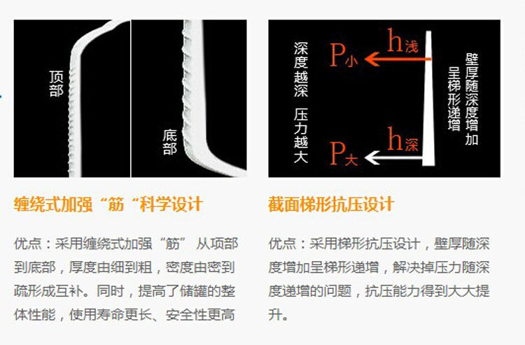 5、久佳儲罐加強(qiáng)筋加厚超耐用,圓柱形桶身有強(qiáng)肋線,符合高強(qiáng)度-重量比,優(yōu)異的抗疲勞強(qiáng)度,有足夠的壁厚,優(yōu)質(zhì)的原料,更多投料/更厚桶身,使用壽命從常規(guī)級別的15年提升至20年.